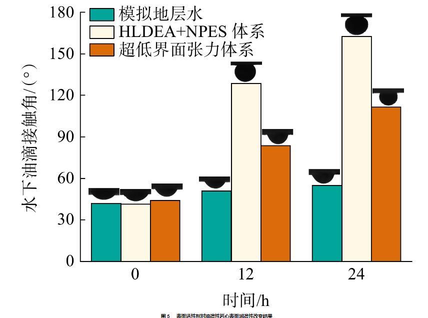 通過評(píng)價(jià)表面活性劑體系在親油巖心表面的潤濕性來考查體系潤濕調(diào)控能力,實(shí)驗(yàn)結(jié)果如圖5所示。從圖5可知,地層水可較微弱地改變親油巖心表面潤濕性,但表面仍為親油表面。超低界面張力體系作用下,可在24 h內(nèi)將表面水下油滴接觸角由43.98°改性到111.35°。調(diào)控界面潤濕性效果最為顯著的是HLDEA+NPES體系,24 h內(nèi)水下油滴接觸角由41.34°增至162.53°,實(shí)現(xiàn)強(qiáng)親水改性。