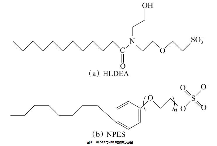 將配制好的穩(wěn)定性優(yōu)異的復(fù)配體系[0.15%(w)HLDEA+0.15%(w)助表面活性劑]置于75℃條件下,測定復(fù)配體系的油水界面張力,結(jié)果見圖3。由圖3可得,復(fù)配后體系油水界面張力隨時(shí)間均出現(xiàn)先下降后基本保持平衡的趨勢。HLDEA與兩種陰非離子型表面活性劑APEC-4Na和NPES復(fù)配后體系的油水界面張力降低至接近超低界面張力水平(10?3 mN·m?1)。這是因?yàn)镠LDEA分子小、親油性高,其擴(kuò)散速度快且傾向于進(jìn)入油滴內(nèi)部,同時(shí),溶液中的NPES分子隨時(shí)間推移逐步被吸引于油水界面,尾鏈與HLDEA分子相互糾纏形成緊密結(jié)構(gòu),提高了油水界面吸附膜的致密程度,從而使界面張力大幅降低。最終優(yōu)選出的助表面活性劑為NPES,在與HLDEA復(fù)配后體系界面張力值為3.8×10?3 mN/m。HLDEA與NPES結(jié)構(gòu)式見圖4。作為對比的超低界面張力體系油水界面張力值為2.9×10?4 mN/m,較HLDEA+NPES體系界面張力低了一個(gè)數(shù)量級(jí)。