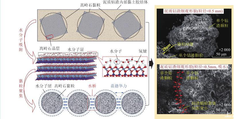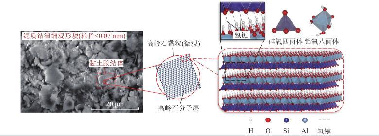 圖2中,在微觀尺度層面,由于高嶺石形成過程中發生同晶置換,使晶層表面帶永久負電荷。當高嶺石黏粒遇水時,水分子的偶極性使氫原子易與高嶺石晶層表面電負性較強的氧原子結合形成氫鍵,同時,吸附在晶層表面的水分子之間也會通過氫鍵連接,該過程即為水分子的吸附過程。當第1層水分子被高嶺石黏粒吸附后,其外側氧原子呈負電性,繼續與第2層水分子的氫原子以氫鍵形式結合,最終形成多層水分子“水膜”。高嶺石黏粒不斷吸水擴層,使鉆渣顆粒體積不斷膨脹,同時伴隨鉆渣內部非泥質礦物的溶解,高嶺石黏粒間距變小,并通過外側“水膜”相互吸附,構成“水橋”,使得多個高嶺石黏粒能夠在遇水后聚集,形成更大的團聚體。