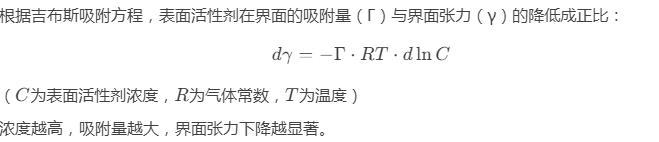 根據(jù)吉布斯吸附方程,表面活性劑在界面的吸附量(Γ)與界面張力(γ)的降低成正比: