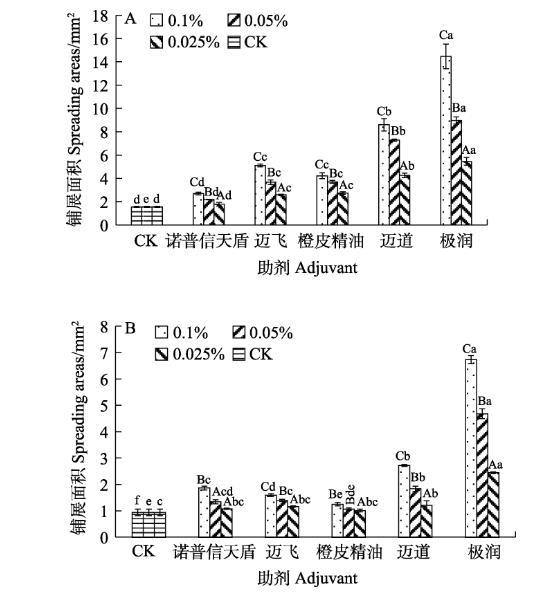 A:正面;B:背面。不同大寫字母表示同種助劑不同濃度間差異顯著(P<0.05);不同小寫字母表示同一濃度不同助劑間差異顯著(P<0.05)。