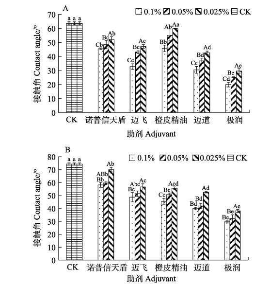 圖3不同助劑對(duì)藥液在杧果葉片接觸角的影響