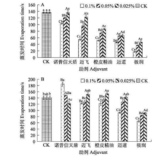 葉片背面,助劑質(zhì)量分?jǐn)?shù)為0.025%時(shí),與CK相比,極潤(rùn)助劑能使藥液蒸發(fā)時(shí)間縮短34.84%,其次是諾普信天盾縮短12.56%,而邁道和邁飛與CK間無(wú)顯著差異,而橙皮精油的蒸發(fā)時(shí)間增加9.24%;助劑質(zhì)量分?jǐn)?shù)為0.05%時(shí),極潤(rùn)助劑使藥液蒸發(fā)時(shí)間縮短41.00%,其次是邁道和邁飛均縮短9.72%,而橙皮精油和諾普信天盾與CK無(wú)顯著差異;助劑質(zhì)量分?jǐn)?shù)為0.1%時(shí),極潤(rùn)助劑使藥液蒸發(fā)時(shí)間縮短53.79%,其次是邁道縮短34.36%,橙皮精油和邁飛則分別縮短13.27%和13.04%,而諾普信天盾的蒸發(fā)時(shí)間增加31.28%(圖5B)。