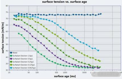 測量結果對應的是一定表面年齡下的表面張力,表面年齡為從氣泡開始產生到最大壓力之間的時間。表面張力對表面年齡的關系可以通過不同的鼓泡速度測出。