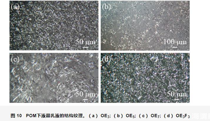 圖10 POM下液晶乳液的結構紋理。(a)OE3;(b)OE5;(c)OE7;(d)OE3P3