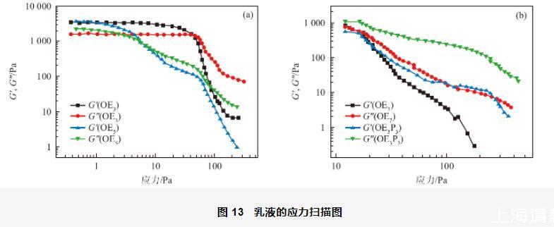 4種乳液的應力掃描結果如圖13所示。從圖13(a)中可以看出,以OE3和OE5為乳化劑制備的乳液存在線性黏彈區,當應力低于屈服應力時,乳液的彈性模量(G')大于黏性模量(G''),表明乳液主要以不穩定的彈性形式存在,乳液的不穩定性主要與大量的水和液體石蠟有關;當應力大于屈服應力時,G'和G''都開始降低,說明乳液內部的微觀結構發生了一定程度的破壞。從圖13(a)還可發現,以OE3為乳化劑制備的乳液比以OE5為乳化劑制備的乳液的線性黏彈區寬,說明前者乳液的穩定性較強,體系不容易沉降或者分層。從圖13(b)中可以看出,以OE7和OE3P3為乳化劑制備的乳液在測定的應力范圍內不存在線性黏彈區,當應力接近10 Pa時,兩種溶液的G'和G''就開始降低,即乳液結構遭到了破壞。根據應力掃描結果發現,以OE3為乳化劑制備的乳液的穩定性明顯強于其它3種乳液,這可能是因為,當分別以OE5、OE7和OE3P3為乳化劑時,由于其分子結構中長的、卷曲的EO鏈和支化的PO鏈在液滴表面形成的界面層不夠穩定所致。