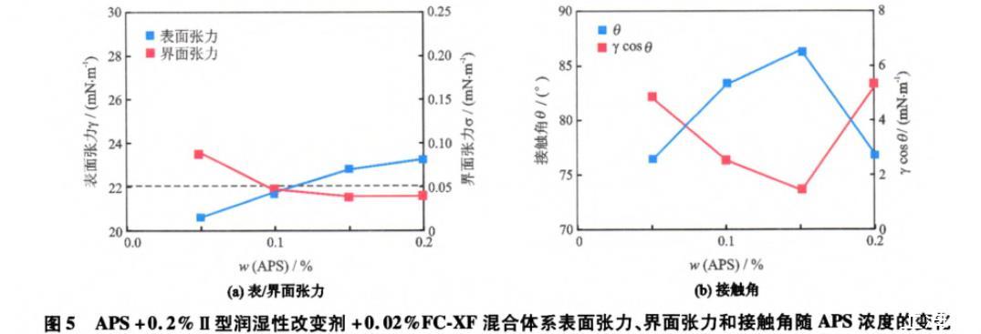 從圖5(a)中可以看出,隨著APS質(zhì)量分?jǐn)?shù)的增加,體系的表面張力增大,界面張力減小,這與FXCF對表/界面張力的影響機(jī)制相同。從圖5(b)中可以看出,隨著APS質(zhì)量分?jǐn)?shù)的增加,體系與巖石的接觸角先增加再減小,相應(yīng)的γcosθ先減小再增大,均出現(xiàn)極值點(diǎn),這與圖4(b)的變化趨勢不同。這是因?yàn)槲舰蛐蜐櫇裥愿淖儎┖虵C-XF使得巖石表面由水濕轉(zhuǎn)變?yōu)槿跤H水性潤濕(接觸角<75°),更易于吸附APS的親水頭基而使碳?xì)滏溤趲r石表面暴露,這降低了巖石表面的親水性,因而隨著APS質(zhì)量分?jǐn)?shù)的增加接觸角增大。但是,當(dāng)APS質(zhì)量分?jǐn)?shù)大于0.15%后,過多的APS分子可能在巖石表面發(fā)生雙分子層吸附或因競爭吸附而降低Ⅱ型潤濕性改變劑的吸附量,使得巖石表面的親水性增加。而且,接觸角的變化決定了γcosθ的變化趨勢,因而接觸角和γcosθ隨APS質(zhì)量分?jǐn)?shù)的變化曲線中均出現(xiàn)極值點(diǎn)。