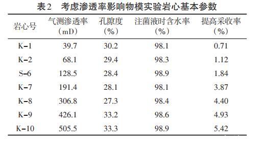 (2)效果評價及影響因素分析巖心注入0.1PV菌液,室溫放置7d后,不同滲透率油藏環境對微生物提高采收率影響顯著,由實驗結果顯示(表2),巖心滲透率從39.7mD升高至505.5mD,微生物提高采收率從0.71%升高至5.42%,隨著滲透率的增加,微生物驅油提高采收率幅度增大。