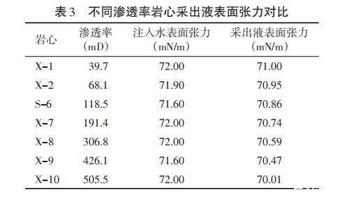 (1)實驗方法采用芬蘭Kibron EZ-Pi Plus便攜式動態表面張力儀檢測不同滲透率的巖心二次水驅采出液的表面張力。