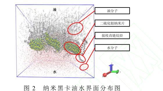 計算水分子、油相分子和納米黑卡之間的相互作用,截斷半徑分別為10?和12?。所構建的油水界面體系由31 500個油分子和17693個水分子組成,并將納米黑卡置于所構建的油水界面體系中。如圖2所示,油水界面上層部分的碳氫鏈表示油分子,油水界面下層區域代表水分子。