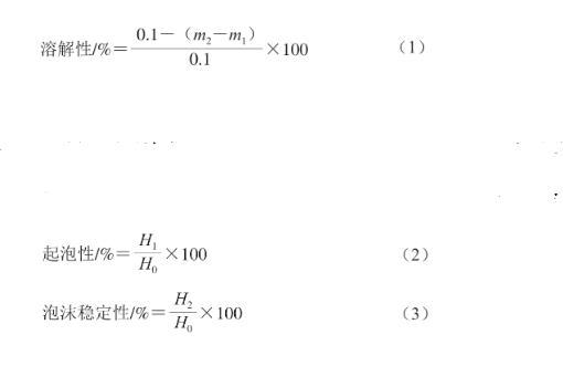 樣品分散于蒸餾水中制成質量濃度為1 g/100 mL的蛋白溶液。取20 mL樣品溶液放置于50 mL燒杯中,記錄初始高度(H0),以13 500 r/min高速間歇攪打2 min,立刻記錄此時泡沫高度H1,室溫下靜置30 min后的記錄泡沫高度H2。起泡性和泡沫穩定性按照式(2)、(3)計算: