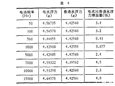 實(shí)驗(yàn)用的振蕩穩(wěn)壓源是上海華東電子儀器廠制造的,輸出功率75W,該電源的電壓在實(shí)驗(yàn)時(shí)保持300V、600V和700V三個(gè)數(shù)值。改變頻率從0到15kHz,水流過電場(chǎng)的速度為0.16m/s,水溫12.0±0.3℃,用長(zhǎng)春市自來水和地下深井水。電水形成后20分鐘開始測(cè)浮力。測(cè)試時(shí)間為1984年10月18日到1984年10月21日,重復(fù)性實(shí)驗(yàn)進(jìn)行六次,曲線都帶有極值。表4是在電壓600V下的一組數(shù)據(jù)。