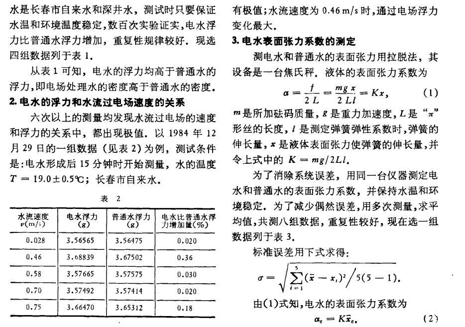 以一定速度流過電場(chǎng)(特定電壓和頻率)的水簡(jiǎn)稱為電水。電水的物理特性包括它的密度、粘滯度、表面張力、時(shí)間效應(yīng)、pH值和電導(dǎo)率等,以及上述各參量隨電場(chǎng)電壓和頻率變化的關(guān)系。本文主要用對(duì)比的方法,測(cè)定了電水的表面張力系數(shù)、浮力,浮力隨電場(chǎng)頻率變化情況,電水的時(shí)間效應(yīng)。