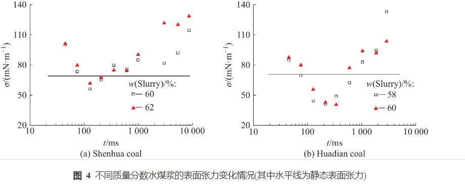 圖4不同質(zhì)量分?jǐn)?shù)水煤漿的表面張力變化情況(其中水平線為靜態(tài)表面張力)