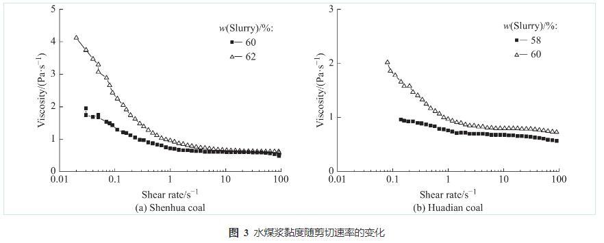 黏度、屈服應(yīng)力等水煤漿的流變特性對(duì)漿體破裂過(guò)程有重要影響。在水煤漿中,煤粉顆粒、分散劑和水形成了相對(duì)穩(wěn)定的三維空間結(jié)構(gòu),此時(shí)未被吸附、未參與形成緊密水化膜的自由水分布在這種三維結(jié)構(gòu)的空隙中。這種空間結(jié)構(gòu)在遭受剪切時(shí)很容易被破壞,從而導(dǎo)致分布在三維空間結(jié)構(gòu)空隙中的自由水被釋放,黏度降低;同時(shí),剪切應(yīng)力越大,水煤漿的黏度越小,所以水煤漿一般為剪切變稀的假塑性流體。