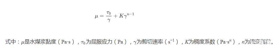 式中:是水煤漿黏度(Pa·s),為屈服應(yīng)力(Pa),為剪切速率(s?1),K為稠度系數(shù)(Pa·sn),n為流變指數(shù)。擬合關(guān)系式相關(guān)系數(shù)為0.98,擬合參數(shù)見(jiàn)表2。