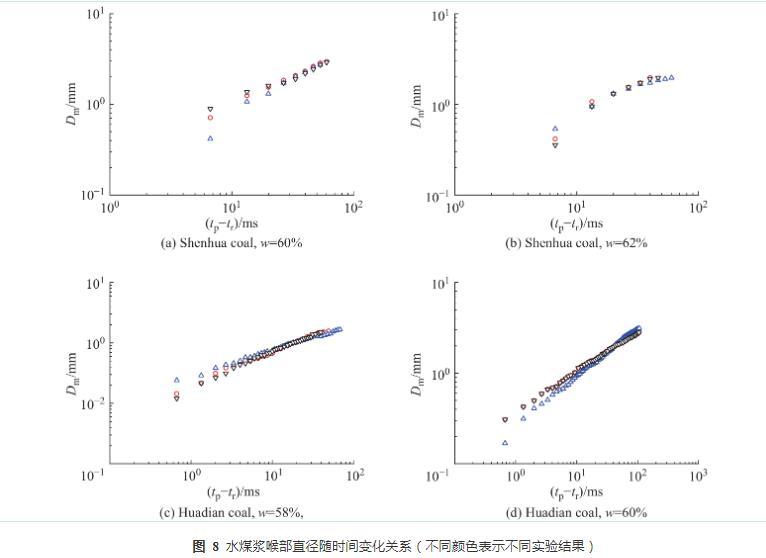 圖8水煤漿喉部直徑隨時(shí)間變化關(guān)系(不同顏色表示不同實(shí)驗(yàn)結(jié)果)
