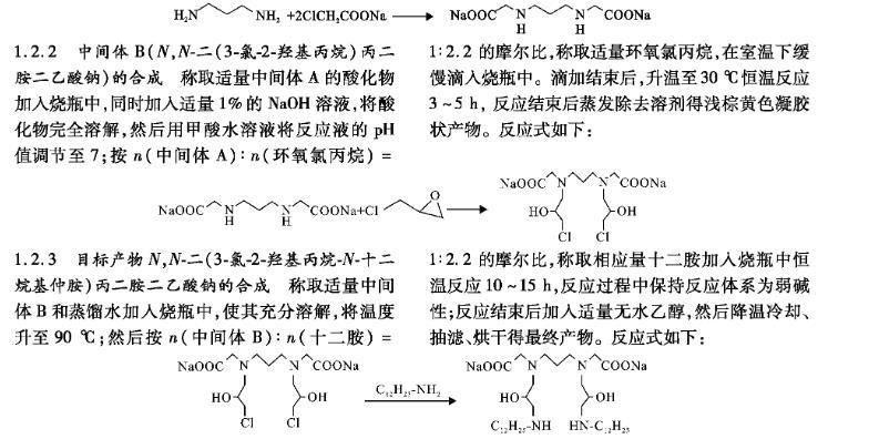 1,3-丙二胺與氯乙酸鈉反應合成中間體A(N,N-丙二胺二乙酸鈉);中間體A與環氧氯丙烷反應生成中間體B(N,N-二(3-氯-2-羥基丙烷)丙二胺二乙酸鈉);中間體B最后與十二胺反應生成目標產物,N,N-二(3-氯-2-羥基丙烷-N-十二烷基仲胺)丙二胺二乙酸鈉(簡稱GAC-312)。