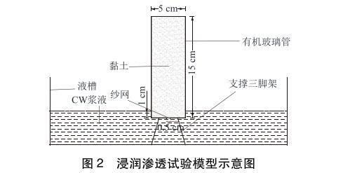 浸潤(rùn)滲透試驗(yàn)?zāi)P腿鐖D2所示,主要由液槽、支撐三腳架和透明有機(jī)玻璃管組成。有機(jī)玻璃管直徑5cm,高15cm,頂端敞開,底部封閉鉆有直徑0.5cm的進(jìn)漿孔。試驗(yàn)時(shí)將黏土裝入有機(jī)玻璃管中,振搗壓實(shí),底部開孔處墊有紗網(wǎng),防止土體掉落。將有機(jī)玻璃管和支撐三腳架放入漿液槽內(nèi),有機(jī)玻璃管底部浸入漿液液面以下1.0cm,使?jié){液從底部滲入黏土中,通過觀察漿液在不同時(shí)間的滲透高度來評(píng)價(jià)漿液的浸潤(rùn)滲透效果。