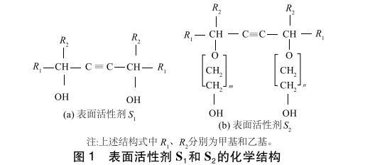 ?炔屬二醇表面活性劑(S1、S2),其臨界膠束濃度(CMC)為0.1%,化學(xué)結(jié)構(gòu)如圖1所示,美國(guó)氣體化學(xué)公司生產(chǎn);