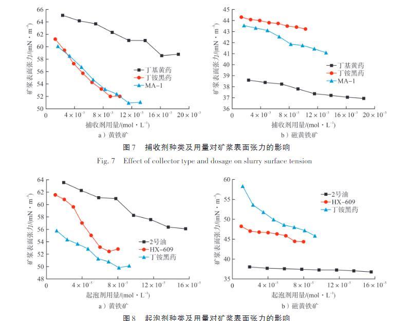 圖7捕收劑種類及用量對(duì)礦漿表面張力的影響