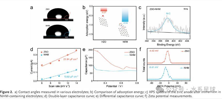 本研究探索了一種新型有機NHM添加劑,旨在增強陽極界面穩定性并改善鍍覆/剝離行為。通過降低界面張力,NHM添加劑重塑了電雙層(EDL),有效限制了鋅陽極與H?O之間的接觸,從而抑制了寄生反應。