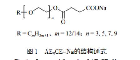 表面活性劑是一類(lèi)應(yīng)用廣泛的有機(jī)化合物,極少的用量就能顯著提高溶液的性能,因此,表面活性劑的研究具有重要的現(xiàn)實(shí)和理論意義。其中,陰離子和非離子型表面活性劑的用量最多且應(yīng)用最為廣泛,它們具有優(yōu)異的去污性、水溶性、耐熱性、耐鹽性及制備成本低和環(huán)境友好等優(yōu)點(diǎn)。然而,傳統(tǒng)的表面活性劑分子通常只包含一個(gè)親水頭基和一個(gè)疏水尾鏈,很難同時(shí)具有陰離子和非離子表面活性劑的特性。值得一提的是,脂肪醇醚琥珀酸酯鹽(AEnCE-Na,n=3,5,7,9)是一種新型的表面活性劑,結(jié)構(gòu)通式如圖1所示。結(jié)構(gòu)決定性質(zhì),因此,可以推斷AEnCE-Na具有許多優(yōu)異的性能:1)一個(gè)分子中同時(shí)存在兩個(gè)親水基團(tuán)(EO鏈和陰離子頭基)和一個(gè)疏水基團(tuán)(烷基碳鏈),使其具有優(yōu)異的表面活性、乳化性和發(fā)泡性;2)分子中的酯基在水解后可形成具有優(yōu)異生物降解性的非離子表面活性劑和鹽,因此,該類(lèi)表面活性劑安全且環(huán)保,符合當(dāng)代“綠色化”的發(fā)展理念;3)直鏈表面活性劑比支鏈表面活性劑具有更好的自降解能力。然而,目前對(duì)于脂肪醇醚琥珀酸酯鹽表面活性劑的研究甚少。