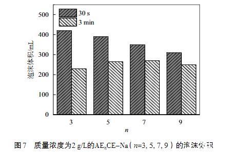 圖7質量濃度為2 g/L的AEnCE-Na(n=3,5,7,9)的泡沫體積