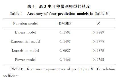 留一法交叉驗證是建立預(yù)測模型的一種常用方法,從N個觀測數(shù)據(jù)中選擇一個觀測數(shù)據(jù)作為驗證數(shù)據(jù),然后使用剩下的(N-1)個觀測數(shù)據(jù)擬合一個模型,并用驗證數(shù)據(jù)來驗證模型的精度,如此重復(fù)N次。考慮到數(shù)據(jù)量以及相關(guān)性,筆者利用Excel建立了線性、指數(shù)、對數(shù)、乘冪4種預(yù)測模型,對小桐子生物柴油酸值的預(yù)測結(jié)果見表3。