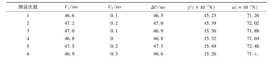 表3改進(jìn)后金屬吊環(huán)測量液體的表面張力系數(shù)數(shù)據(jù)表(水溫25℃)