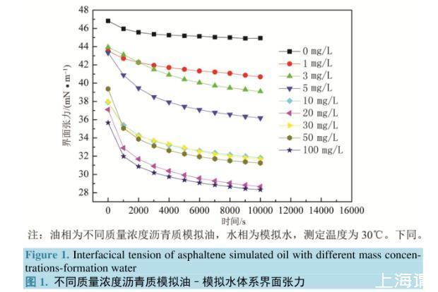 圖1.不同質量濃度瀝青質模擬油–模擬水體系界面張力