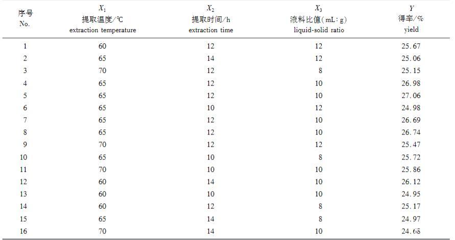 通過(guò)軟件分析得到肥皂莢皂苷的最優(yōu)提取條件為:溫度69.20℃、時(shí)間11.28 h、液料比值9.89,皂苷得率的預(yù)測(cè)值為26.44%。為了操作方便,修正提取條件為:溫度69℃、時(shí)間11 h 15 min、液料比值為10。在此條件下對(duì)肥皂莢皂苷進(jìn)行水浸提,并做3次重復(fù)性實(shí)驗(yàn),平均得率為26.49%,與理論值誤差僅為0.05%。表明該模型可以較好地預(yù)測(cè)肥皂莢皂苷的提取工藝。