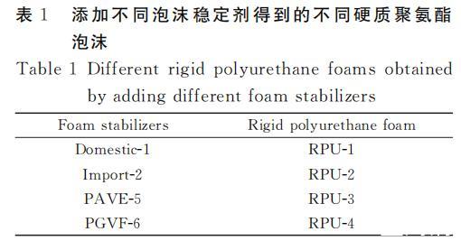 根據(jù)傳統(tǒng)制備工藝制備硬質(zhì)聚氨酯泡沫,分別把添加國(guó)產(chǎn)-1、進(jìn)口-2、PAVE-5和PGVF-6泡沫穩(wěn)定劑得到的硬質(zhì)聚氨酯泡沫命名為RPU-1、RPU-2、RPU-3、RPU-4。