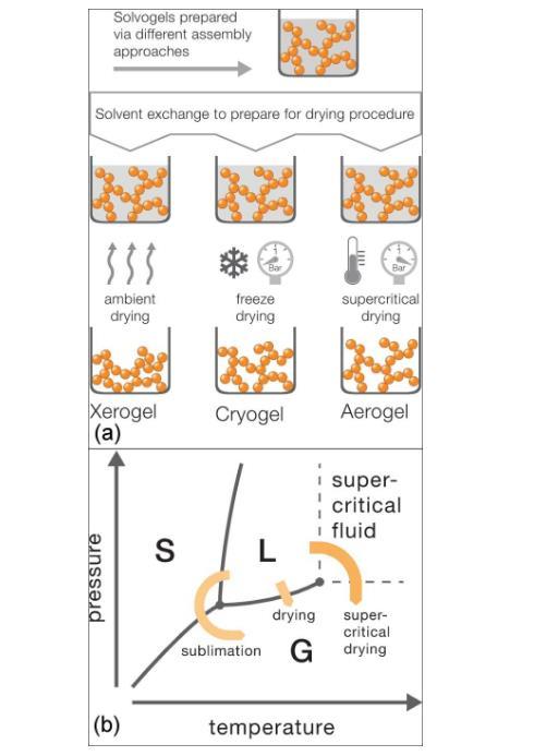 將濕凝膠中的液體轉變為氣體,同時維持骨架結構和體積不變(或較少變化),是氣凝膠制備的另一個核心步驟。如圖5(a)所示,常用的干燥方法有三種:(1)常壓干燥(ambient pressure drying,簡稱APD),得到體積收縮巨大、高密度、孔洞極少的干膠(xerogel)。(2)冷凍干燥(freeze drying),得到體積較少收縮的凍干膠(cryogel)。(3)超臨界流體干燥(supercritical liquid drying,簡稱SCLD),得到體積和結構都較少變化的氣凝膠。