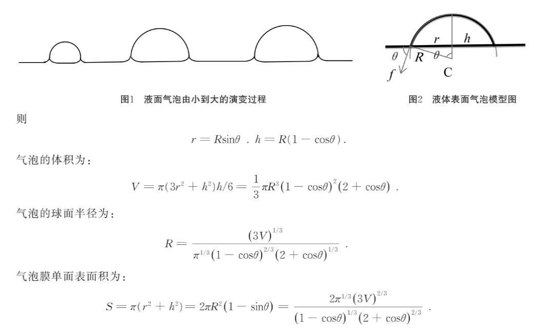 氣泡一般是由于氣體通過小孔浸人液體層后分散擴張形成的.在氣泡形成過程中,由于液體表面張力的作用,使液膜呈收縮趨勢.球形氣泡的液膜表面積最小,所以,在沒有其他因素影響的條件下,空中和液體中的氣泡應(yīng)處于球形的亞穩(wěn)狀態(tài).當(dāng)氣泡落在液體表面或由液體內(nèi)部上升到液體表面以后,沒破裂的氣泡不再呈現(xiàn).球形狀態(tài),與液體表面直接形成的氣泡一樣,呈現(xiàn)球缺形狀.液面氣泡由小到大的演變過程如圖1所示.當(dāng)氣泡足夠大時,液體表面氣泡實際形狀接近半球,但在氣泡與液體表面接觸處可觀察到氣泡內(nèi)、外均存在液面向上彎曲現(xiàn)象,且泡內(nèi)水平液面相比氣泡外水平液面位置出現(xiàn)微小凹陷.