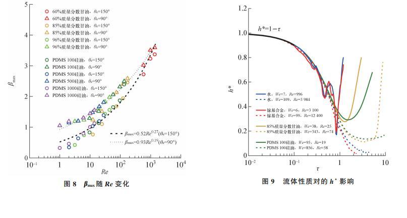如表1所示,文指出在黏性力主導(dǎo)區(qū)(P>1)存在規(guī)律βmax∝Re0.2.本文在黏性力區(qū)的研究采用3種質(zhì)量分?jǐn)?shù)的甘油溶液、3種型號(hào)的PDMS甘油,黏度變化范圍為10——970 mPa·s,跨越近3個(gè)數(shù)量級(jí)。其中,黏度極高的PDMS1000硅油在低速碰撞壁面時(shí)有Re=1.