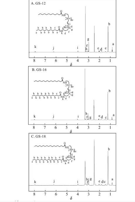 根據(jù)方案1的合成路線,成功制備了3種以1,4-二溴-2-丁烯為連接基團(tuán)的酰胺基Gemini表面活性劑。利用紅外和核磁對(duì)酰胺基Gemini表面活性劑GS-12,GS-16,GS-18進(jìn)行結(jié)構(gòu)表征,結(jié)果見(jiàn)圖1和圖2。