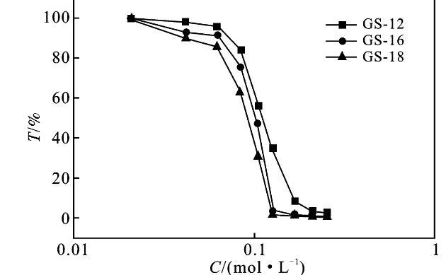 2.2.2耐鹽性能隨著鹽濃度的增加,濁度的突然增加是表面活性劑溶液中宏觀相分離的標(biāo)志,這就是鹽析現(xiàn)象[7,11]。圖4為KBr/GS表面活性劑溶液,隨著KBr含量的增加,在波長(zhǎng)為500 nm的吸光度變化曲線。以GS-12為例,當(dāng)KBr濃度為0~60 mmol/L時(shí),1 mmol/L的Gemini表面活性劑水溶液為無(wú)色透明,濁度同時(shí)略有下降,說(shuō)明有混合膠束形成。當(dāng)KBr的濃度從60 mmol/L增加到120 mmol/L時(shí),溶液呈現(xiàn)微渾濁,說(shuō)明體系中有少量的表面活性劑顆粒析出。而GS-16,GS-18在更低的濃度下就發(fā)生了鹽析現(xiàn)象。也就是說(shuō),鹽的析出現(xiàn)象是非常復(fù)雜的,這不僅取決于鹽的性質(zhì),而且取決于雙子表面活性劑的結(jié)構(gòu)[12-13]。此外,由圖4透過(guò)率的變化可知,隨著疏水鏈的增長(zhǎng),表面活性劑的耐鹽性能減弱,更容易受鹽濃度的影響。因?yàn)闊o(wú)機(jī)鹽消除離子頭基團(tuán)的電荷,減少吸附膜內(nèi)頭基基團(tuán)與膠束之間的靜電排斥。它們通過(guò)減少頭基之間的靜電相互作用和最小化有效截面積來(lái)促進(jìn)膠束的產(chǎn)生和聚集,導(dǎo)致表面活性劑從溶液中聚沉而析出[13]。