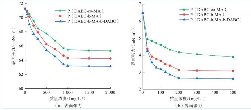 結果表明,所有共聚物均能有效降低表界面張力,具備兩親性。但嵌段共聚物,特別是三嵌段結構,降低張力的能力和效率顯著優于無規共聚物。