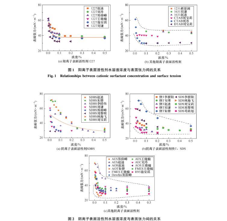 圖1陽離子表面活性劑水溶液濃度與表面張力間的關(guān)系