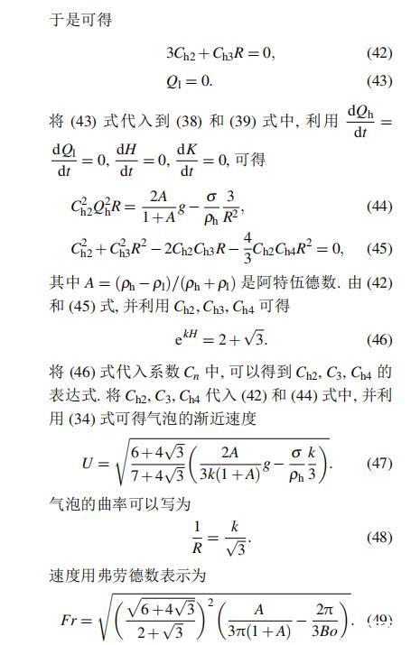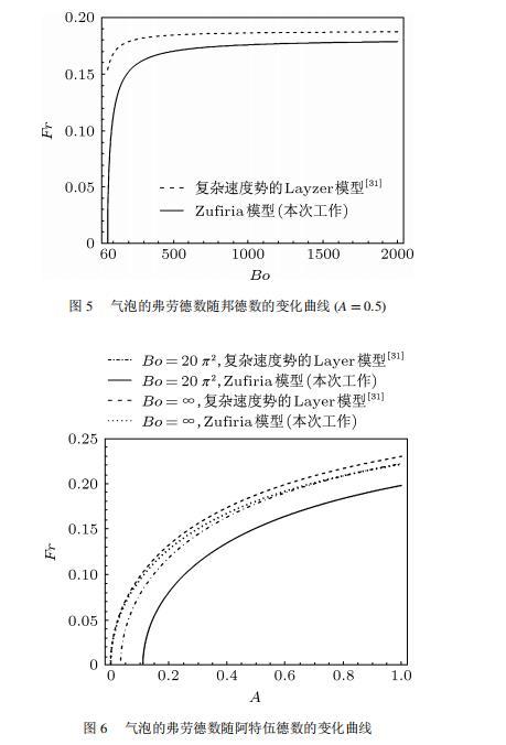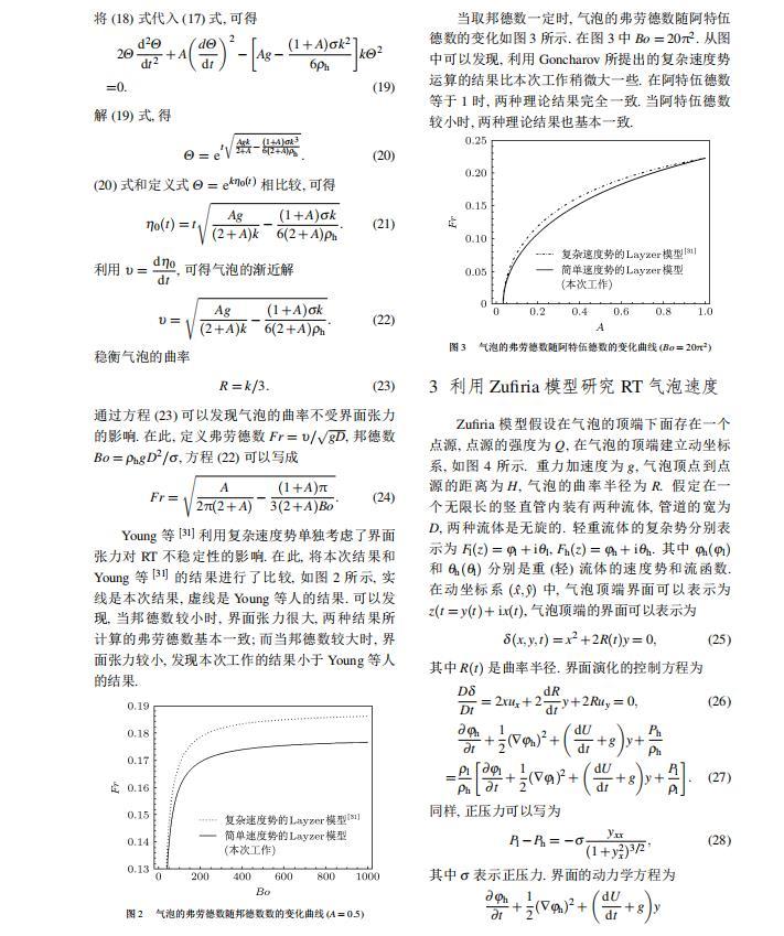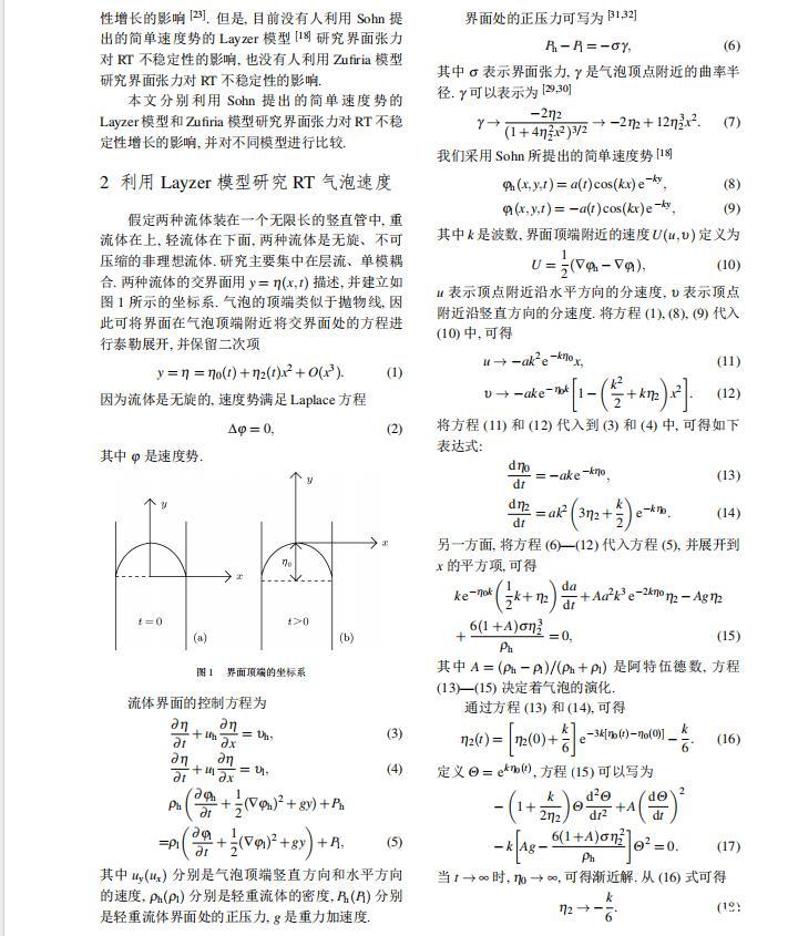 Layzer模型和Zufiria模型都是建立在理想流體之上。然而對實際流體而言,很多因素都可以影響RT不穩定性的演化情況,如密度比、黏性、界面張力、壓縮性、外場加速度、Kelvin-Helmholtz不穩定性等。Young和Sohn利用Goncharov提出的復雜速度勢,將Layzer模型推廣并應用到非理想流體中,研究了界面張力對RT不穩定性增長的影響,發現界面張力降低了氣泡的增長速率。2011年本文的作者之一利用Zufiria模型研究了黏性對RT不穩定性增長的影響。但是,目前沒有人利用Sohn提出的簡單速度勢的Layzer模型研究界面張力對RT不穩定性的影響,也沒有人利用Zufiria模型研究界面張力對RT不穩定性的影響。