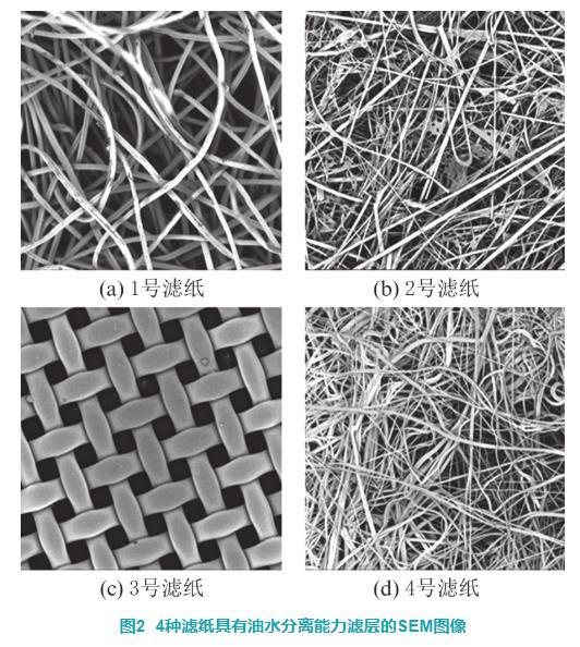 使用Phonem Pro X掃描電子顯微鏡(scanning electron microscope,SEM)在500倍放大倍率下拍攝的4種濾紙的微觀結(jié)構(gòu)如圖2所示。1號濾紙由直徑約為15μm的親水纖維構(gòu)成;2號濾紙的親水層由粗細不同的纖維通過樹脂粘接而成,其中粗纖維還起到增加親水層物理強度的作用;3號濾紙由直徑約為45μm的聚四氟乙烯纖維絲編制,兩根纖維之間的距離約為44μm;4號濾紙的b層由疏水材料通過熔噴工藝制成,在平面上纖維分布疏密不均但在空間內(nèi)有著較好的孔隙分布。除了3號濾紙外,其余濾紙均具有油水分離層,同時也具有較為復(fù)雜的空間結(jié)構(gòu)。
