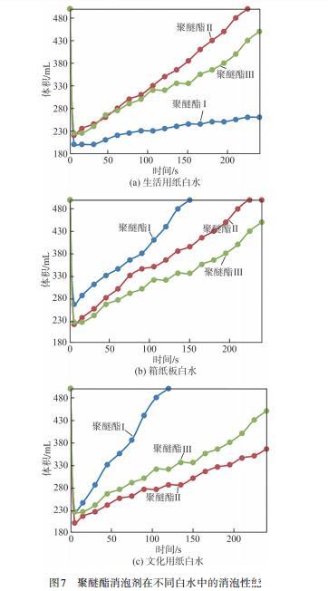 圖7聚醚酯消泡劑在不同白水中的消泡性能