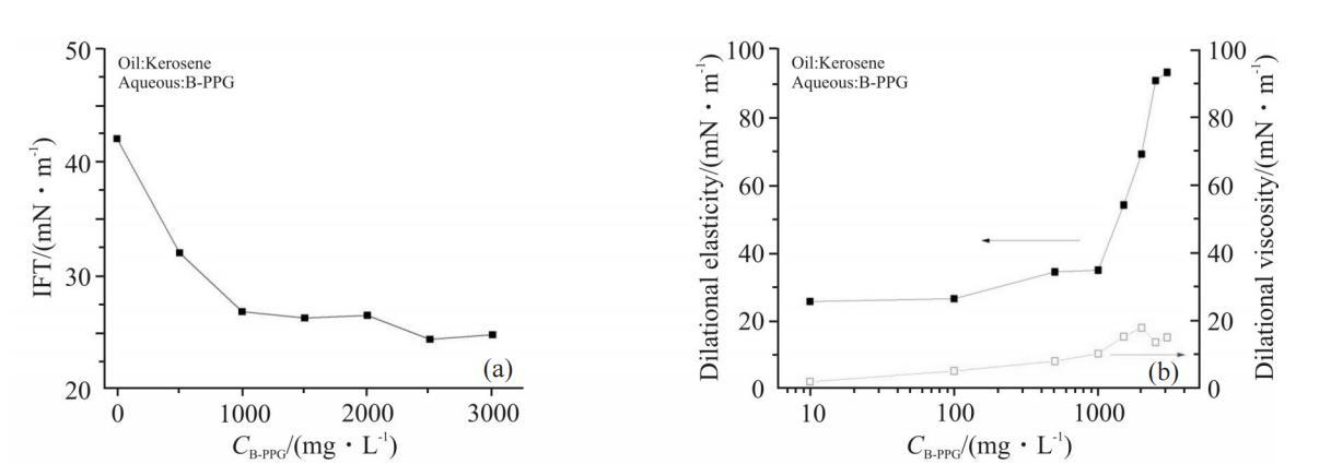 B-PPG是部分支化、部分交聯的聚丙烯酰胺,其分子結構中既含有親水基團丙烯酰胺,又含有疏水的烷基鏈,是一種高分子量的界面活性物質,能夠在油水界面上自發地吸附成膜,降低界面張力。Fig.2為B-PPG濃度對煤油-水界面張力和界面擴張流變參數的影響。由Fig.2(a)可知,B-PPG溶液具有一定的界面活性,隨著其濃度增大,界面張力逐漸降低,濃度高于1000mg/L后,達到平臺值,約為25為mN/m。由Fig.2(b)可以看出,濃度低于1000mg/L時,B-PPG形成的界面膜強度較低,擴張彈性和擴張黏性隨濃度緩慢增大。擴張彈性從約25mN/m升高到35mN/m,擴張黏性從約1mN/m升高到10mN/m;當B-PPG濃度大于1000mg/L時,隨著濃度的增大,界面膜的擴張彈性顯著升高,濃度達到2000mg/L時,擴張彈性高達90mN/m;而擴張黏性變化不大,僅上升到約20mN/m。