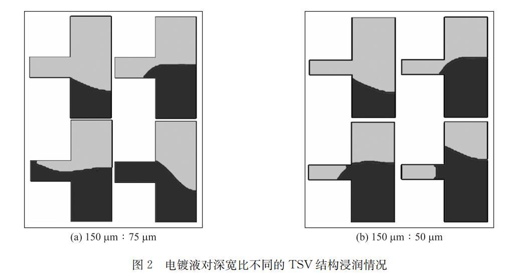 深寬比為150μm:75μm和150μm:50μm的TSV浸潤仿真結(jié)果分別如圖2的(a)(b)所示,前者可以完全浸潤,后者在TSV底部形成氣泡。模擬結(jié)果表明如果不進(jìn)行充分潤濕,深寬比大于2:1的TSV就會因不能完整浸潤而在靠近TSV底部的位置形成部分表面緊貼TSV側(cè)壁的大氣泡,且該氣泡在之后的電鍍過程中難以排出,導(dǎo)致電鍍液無法接觸到TSV底部附近的位置,進(jìn)而形成較大空洞。