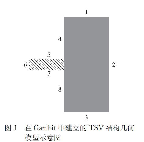 按照實際電鍍液及樣片的情況,在流體仿真軟件中進(jìn)行建模。主要分為2個部分:前處理軟件Gambit中對平面模型的建立,F(xiàn)luent中對流場進(jìn)行具體解算。本文截取TSV軸對稱結(jié)構(gòu)的中心軸截面,建立二維分析模型,直接反應(yīng)實際TSV的浸潤過程。同時,基于對比實驗考慮,忽略電鍍液組分與被浸潤表面化學(xué)反應(yīng)造成的界面影響,并直接采用與電鍍液物理性質(zhì)基本相同的水作為液相組分。氣相組分中采用理想不可壓氣體假設(shè)模擬正常大氣壓下的操作環(huán)境。建立的Fluent分析模型如圖1所示。其中較小的矩形塊代表TSV,4~8代表被潤濕表面。初始情況下,所有被模擬區(qū)域為氣相區(qū)域,之后液相從邊界3以特定流速進(jìn)入(除流速討論單元,其余均設(shè)置為0.05 m/s),逐步潤濕全部或局部表面,直至從邊界1流出。具體設(shè)置為邊界1為壓力出口,2為對稱邊界,3為速度人口,4、5、6、7、8均為壁面邊界條件。表面張力和接觸角均采用實際測量值0.06 N/m,64°;重力加速度為9.81 m/s2,方向為豎直向下。