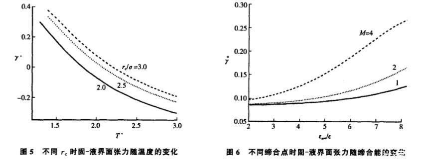 界面張力是化學化工領域非常重要的一個基本參數,其在本質上體現為界面區域分子指向體系內部的聚集趨勢。影響界面張力的因素有很多,其中以溫度和分子間相互作用勢最為顯著。圖 5 給出了界面張力 γ=γ/ε 隨約化溫度 T 的變化曲線。