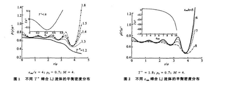 其中 R=σ/2 為分子半徑,Rs 為球腔半徑。在 (8) 的基礎上,利用迭代求解的方法便可得到體系在平衡態下的密度分布。一旦得到分子 的密度分布,很容易計算體系的界面張力 γ 和剩余吸附 Γ。