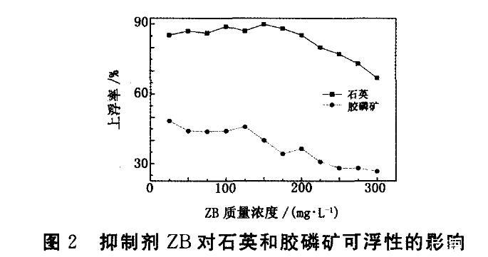從圖2看出,ZB對(duì)膠磷礦和石英的抑制效果明顯,當(dāng)ZB用量為150 mg/L時(shí),兩者上浮率差異達(dá)到最佳,為54.90個(gè)百分點(diǎn)。與圖1對(duì)比可知,使用ZB做調(diào)整劑時(shí),可在用量較低時(shí)得到更好的抑制效果。并對(duì)添加ZB后的礦漿pH值進(jìn)行測(cè)定,當(dāng)ZB用量達(dá)到150 mg/L時(shí),礦漿pH為1.2左右;當(dāng)ZB用量超過(guò)200 mg/L時(shí),石英上浮率仍保持在70%以上,說(shuō)明使用ZB不會(huì)造成石英上浮率明顯下降,更有利于膠磷礦和石英的有效分離。