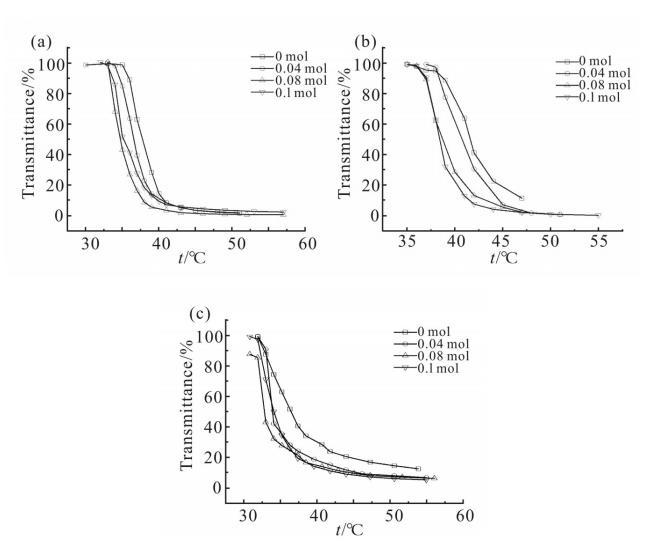 探究了P(NIPAN-b-DMMPPS)中PNIPAM嵌段含量對其臨界溶解溫度的影響,通過改變NIPAM與DMMPPS單體加料的比例,得到一系列PNIPAM嵌段含量不同的P(NIPAN-b-DMMPPS)嵌段共聚物。Fig.9為不同嵌段比例的表面活性劑溶液在500nm波長下的透光率隨溫度的變化。